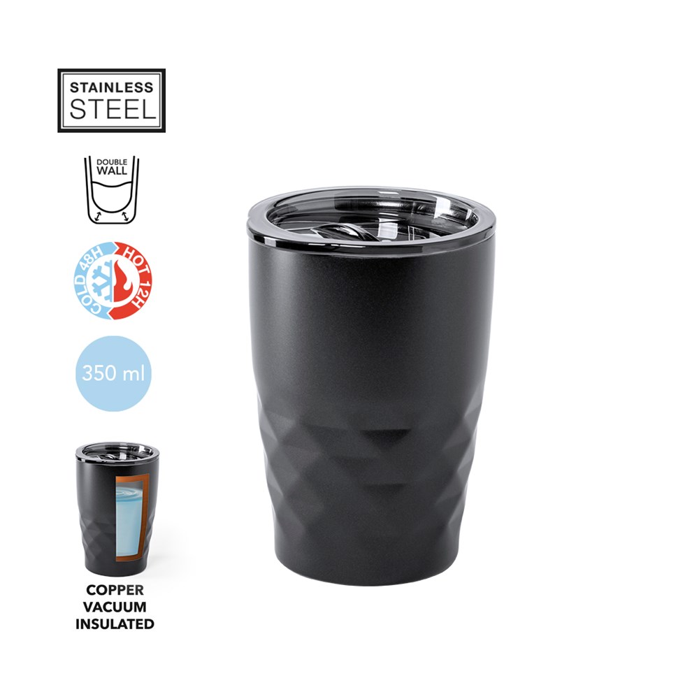 Thermobecher aus rostfreiem Stahl, doppelwandig und mit einer Vakuum-Kupfer-Isolierung. Fassungsvermögen 350 ml. Es ist ideal für Ihren Schreibtisch, Tisch oder jede andere Oberfläche, auf der Sie in Ruhe Ihr Lieblingsgetränk genießen können. Sie ermöglicht es Ihnen, Getränke für eine längere Zeit heiß und kalt zu halten, bis zu 8 bzw. 24 Stunden. Inklusive Deckel mit Spender und Easy-Opener.