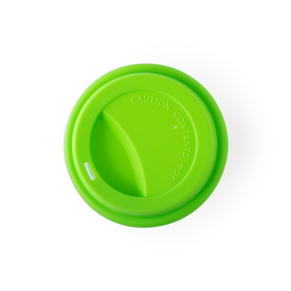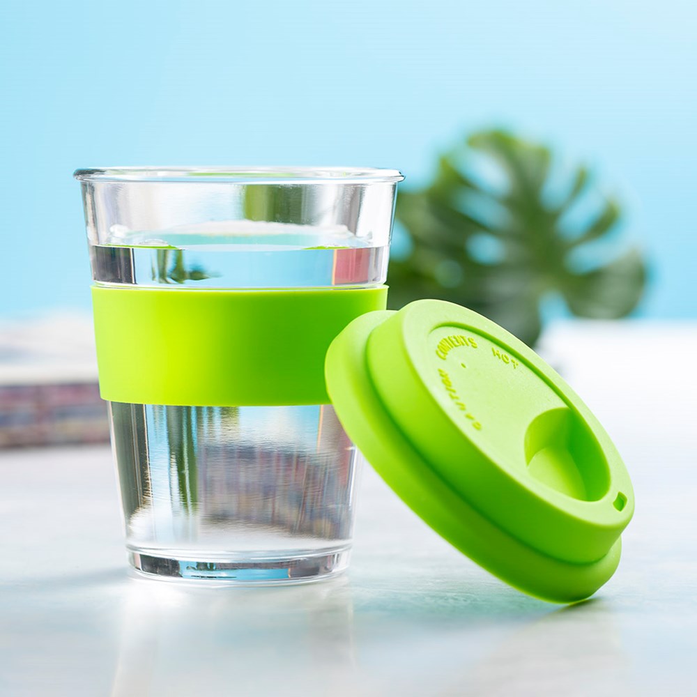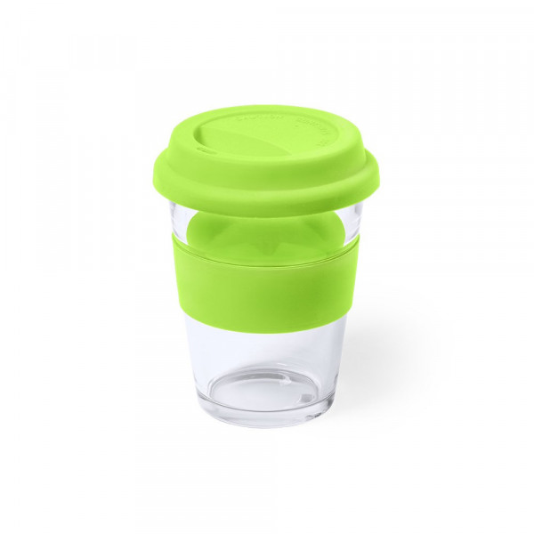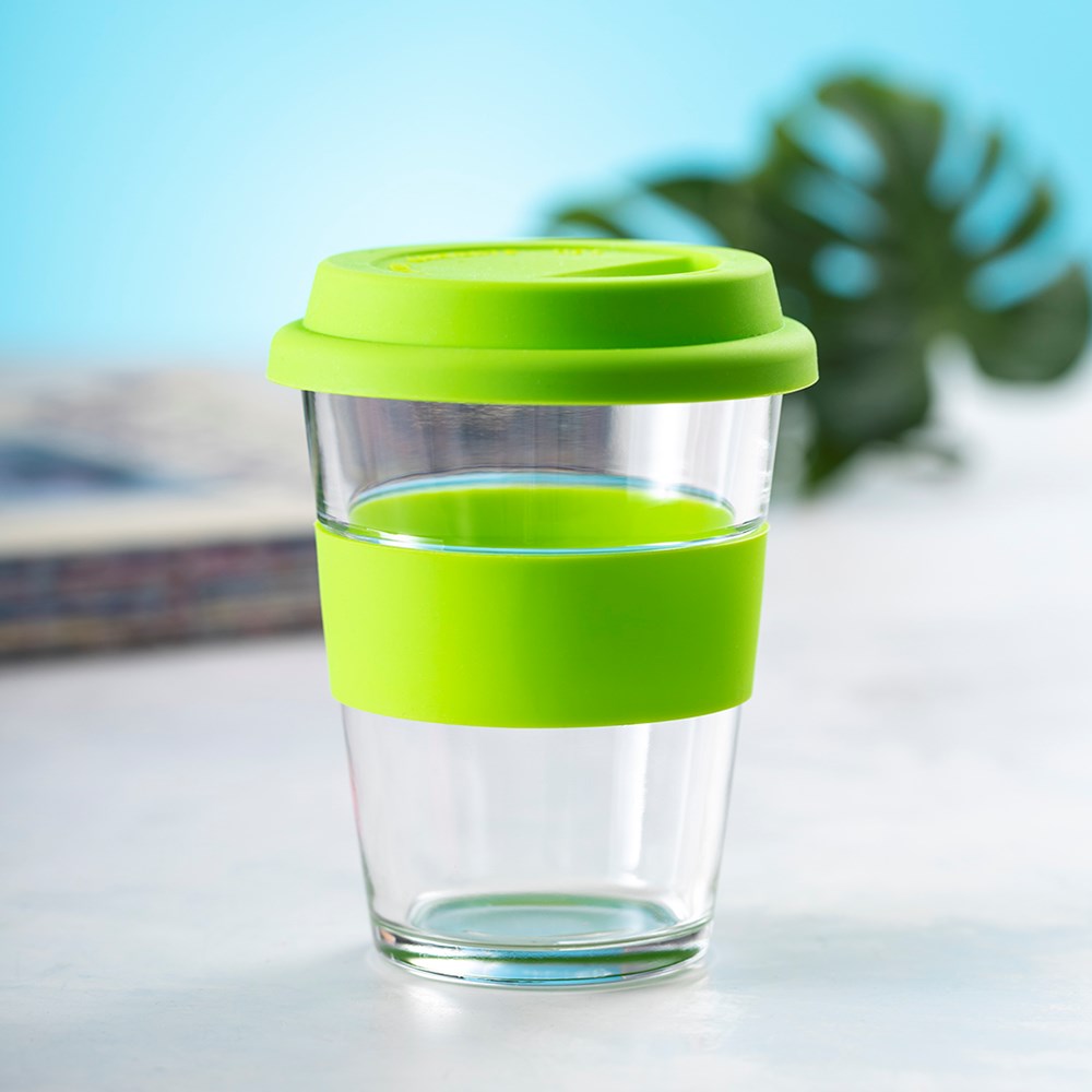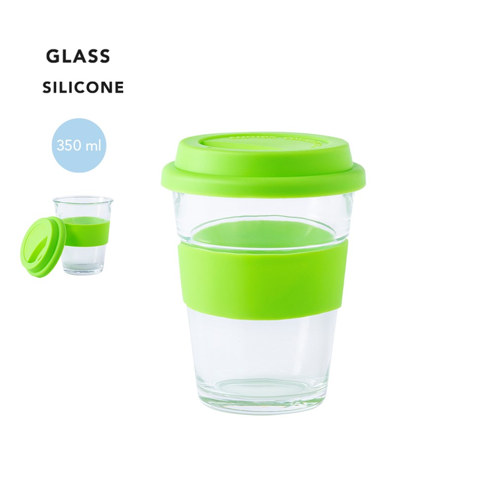 Beker van 350 ml glas. Met anti-verbrandingsstrip en bijpassend gekleurd siliconen deksel. Het is ideaal voor op je bureau, tafel of elk ander oppervlak waar je rustig van je favoriete drankje kunt genieten.