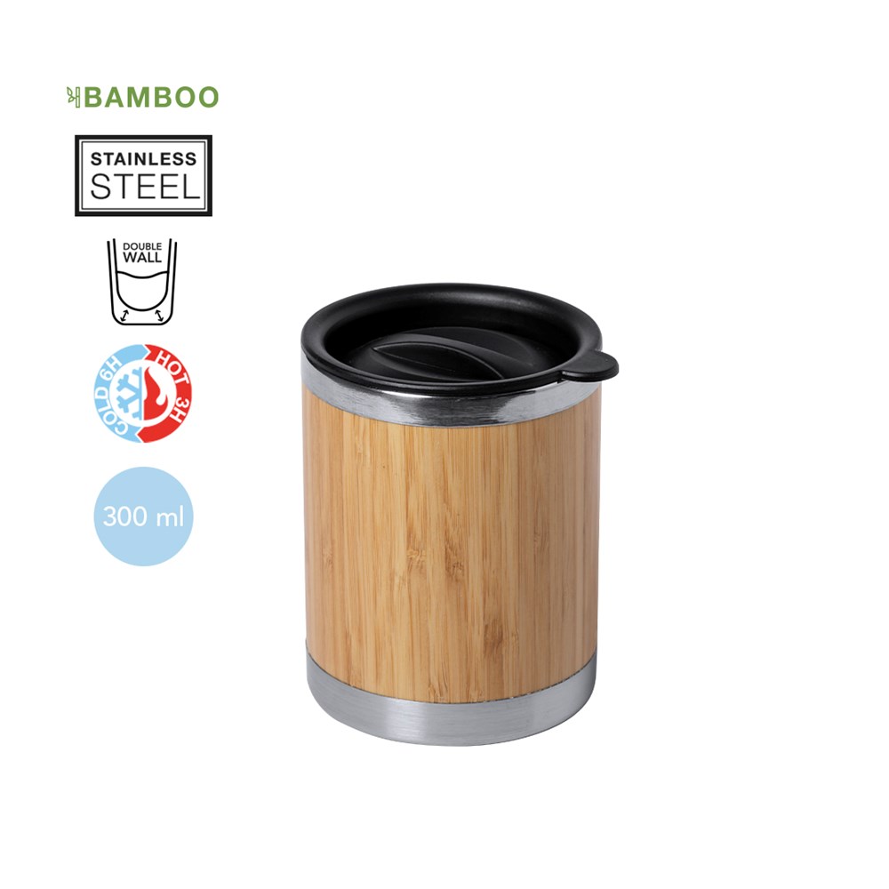 Thermobecher mit einem Fassungsvermögen von 300 ml. Doppelwandiger Körper aus Bambus und Edelstahl für eine bessere und länger anhaltende Temperaturerhaltung. Mit einem originellen schwarzen Dosierdeckel mit einfachem Öffner. Es ist ideal für Ihren Schreibtisch, Tisch oder jede andere Oberfläche, auf der Sie in Ruhe Ihr Lieblingsgetränk genießen können.