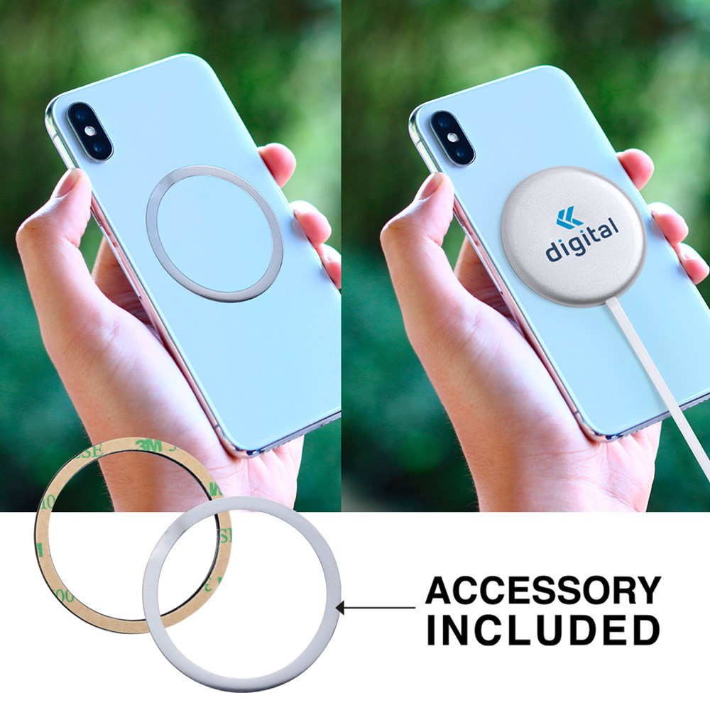 Kabelloses magnetisches Ladegerät 10 W. Gehäuse aus stabilem Aluminium mit silberner Oberfläche. Mit Ladestatusanzeige und 1 m USB-Kabel mit Aluminiumstecker. Inklusive Zubehör aus Metall mit 3M-Kleber, extra stark und rückstandsfrei vom Gerät lösbar, ermöglicht die Nutzung der Magnetfunktion des Ladegeräts an jedem mobilen Gerät. Kompatibel mit Endgeräten, die mit kabelloser Ladetechnik ausgestattet sind. Große Beschriftungsfläche und präsentiert in einer attraktiven Designbox. Verfügbare Betriebsanleitung in Englisch und Spanisch.