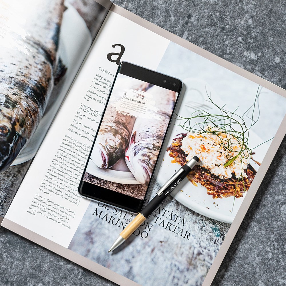 Kugelschreiber der Nature Line mit Druckknopfmechanismus. Elegantes Design mit mattiertem Aluminiumschaft und Bambusgriff, mit mattierten Beschlägen. Metallclip und transparenter Ring, blaue Tinte. Erhältlich in einer breiten Palette von Farben.