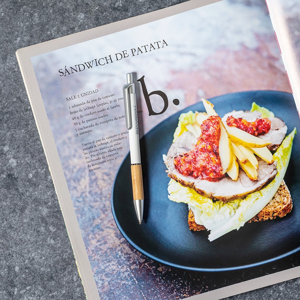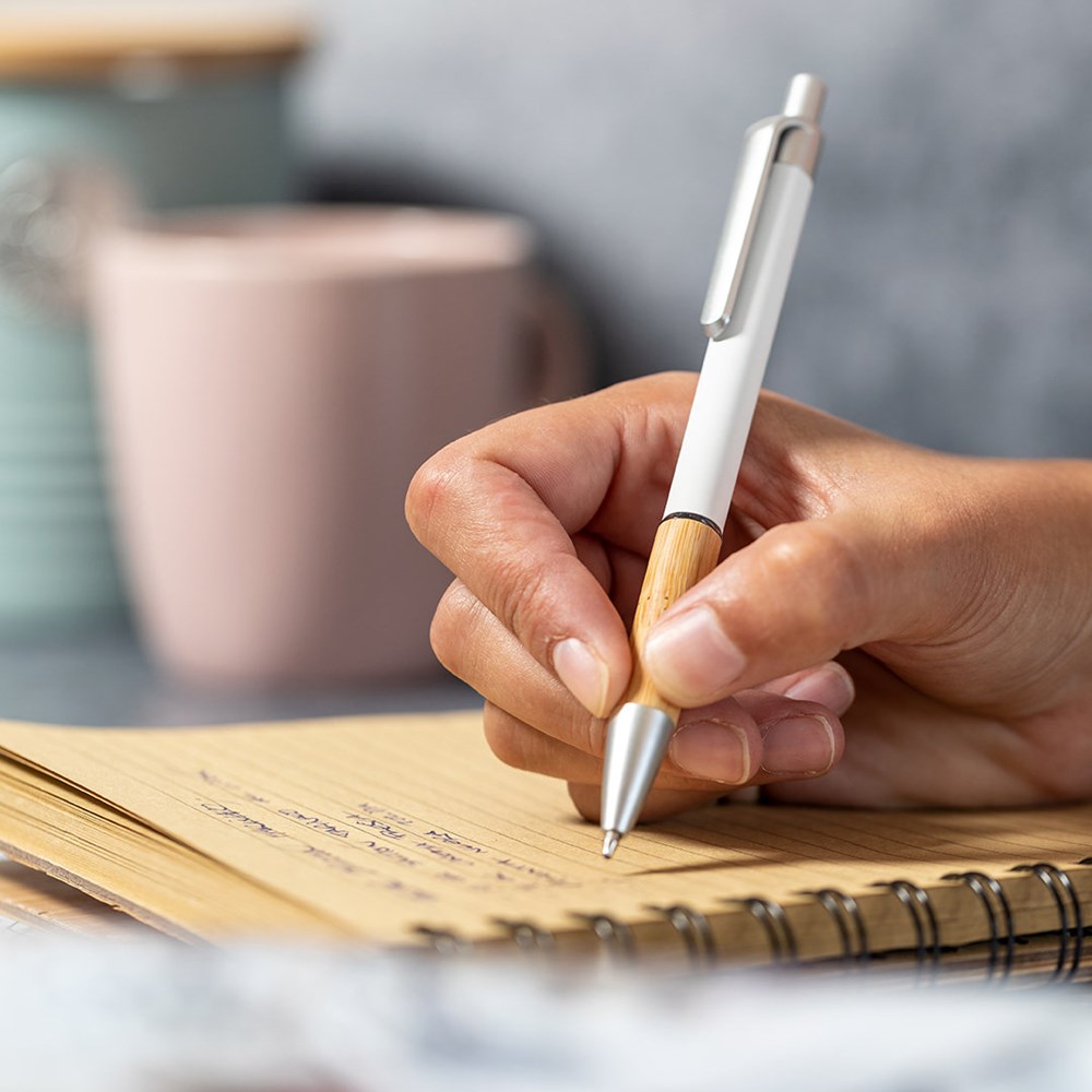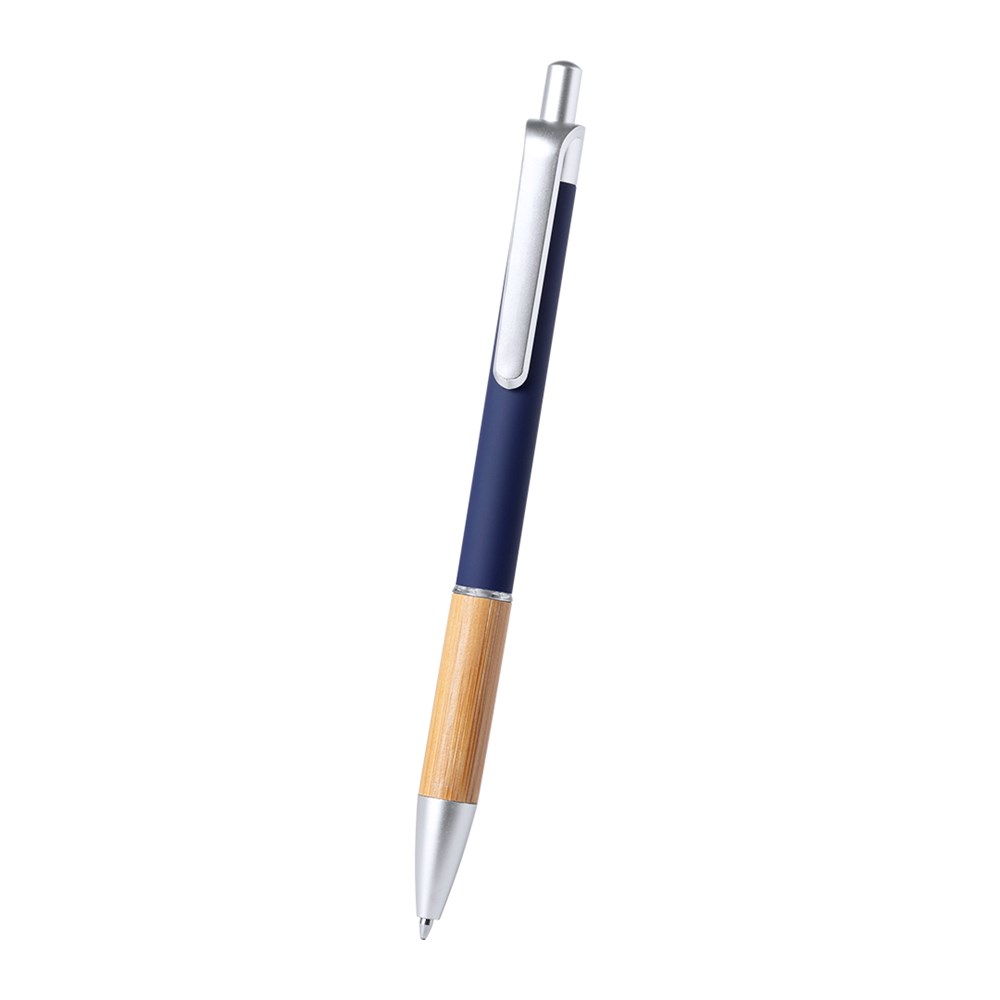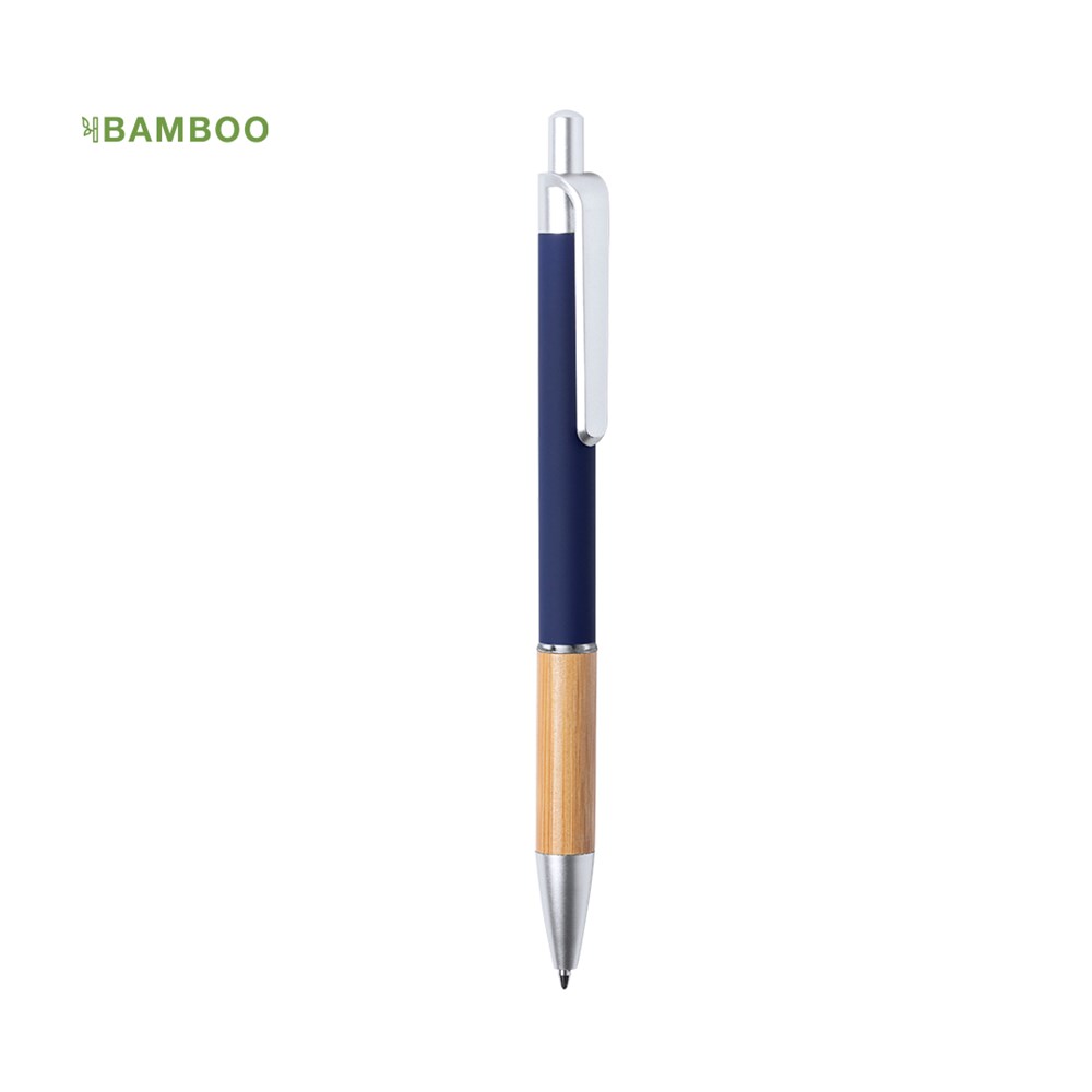 Nature Line Kugelschreiber mit Druckknopfmechanismus. Elegantes Design mit mattiertem Aluminiumschaft und Bambusgriff, mit mattierten Beschlägen. Clip mit Metallic-Finish und transparentem Ring, in blauer Farbe. Erhältlich in einer breiten Palette von Farben.