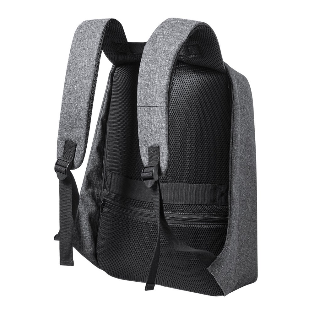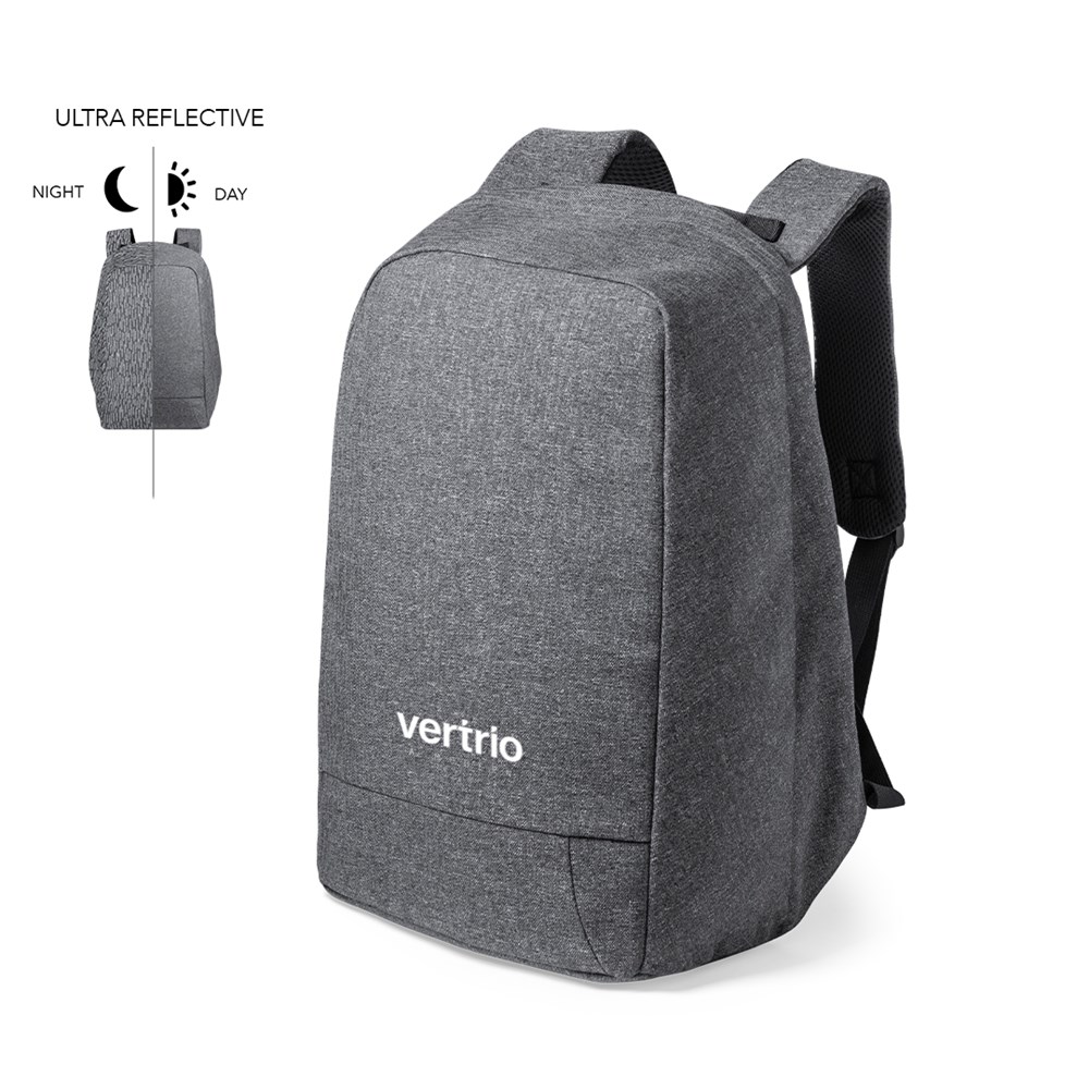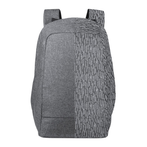 Gut sichtbarer, reflektierender Anti-Diebstahl-Rucksack aus strapazierfähigem, hochwertigem 600D-Polyester mit grauem Finish. Hergestellt unter Verwendung von Glühfäden mit hoher Lichtreflexionsfähigkeit dank Millionen reflektierender Pigmente und basierend auf dem Prinzip der Retroreflexion von Licht, einer Eigenschaft der Nachtsichtbarkeit, die in der Brechung des Lichts in Richtung der Lichtquelle besteht. Spritzwassergeschützt, mit Anti-Diebstahl-Tasche und Trolley-Befestigung. Gepolsterte Innenfächer für Laptops bis zu 15" und Tablets bis zu 12". Gepolsterte Schulter- und Rückengurte.