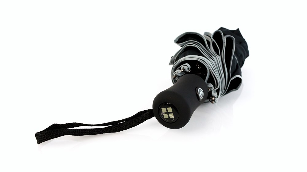 Winddichter Taschenschirm von Antonio Miró mit 8 Panelen aus robustem Pongee-Material und elegantem Design in Schwarz mit weißem Rand. Mit einem Durchmesser von 95 cm, automatischem Öffnungs- und Schließmechanismus und Metallstäben in Schwarz sowie Klettverschluss und ergonomischem Griff mit Trageschlaufe. Präsentiert in einer individuellen, farblich passenden Hülle mit dem Markenlogo.