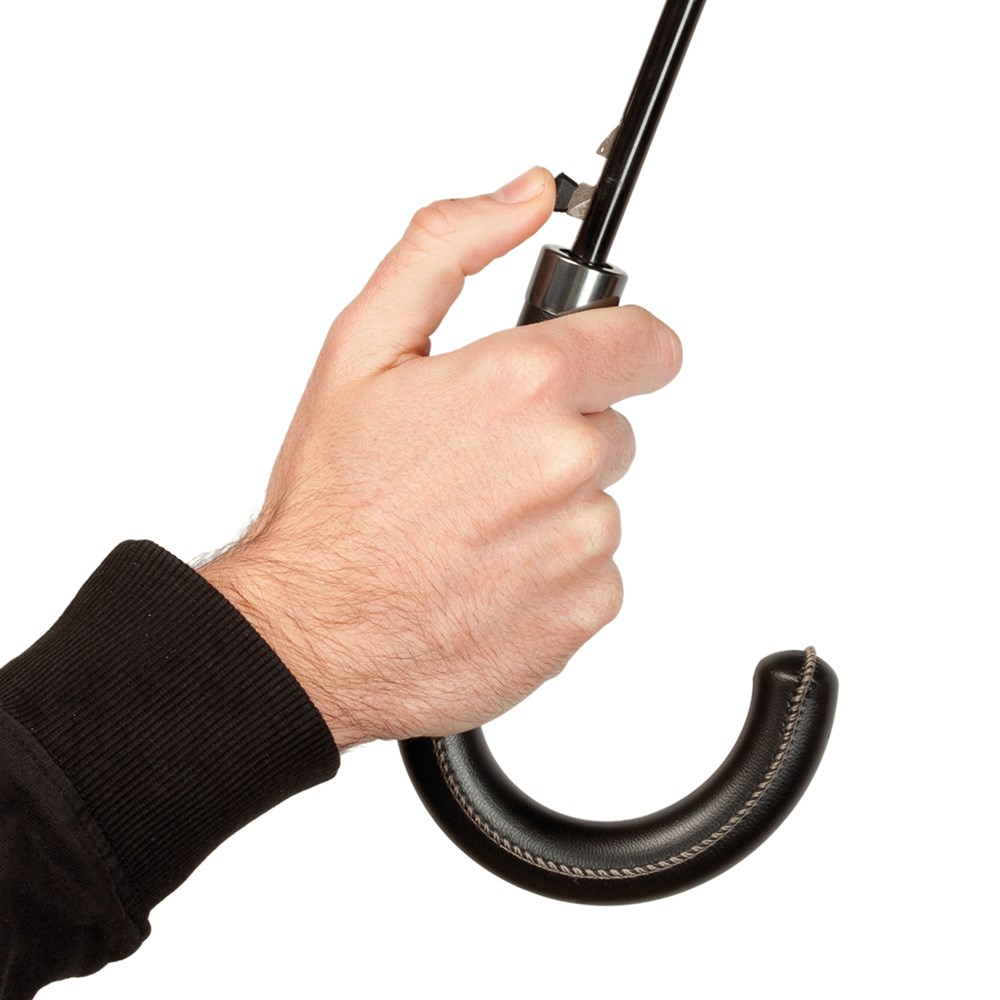 Regenschirm von Antonio Miró mit 8 Panelen aus resistentem Pongee-Material in elegantem Schwarz mit weißer Paspelierung. Mit einem Durchmesser von 100 cm, automatischer Öffnung und Metallstangen in Schwarz sowie Klettverschluss und Soft-Touch-Griff aus Kunstleder. Präsentiert in einer Hülle mit dem Markenlogo und Kordelzug mit Stopper.