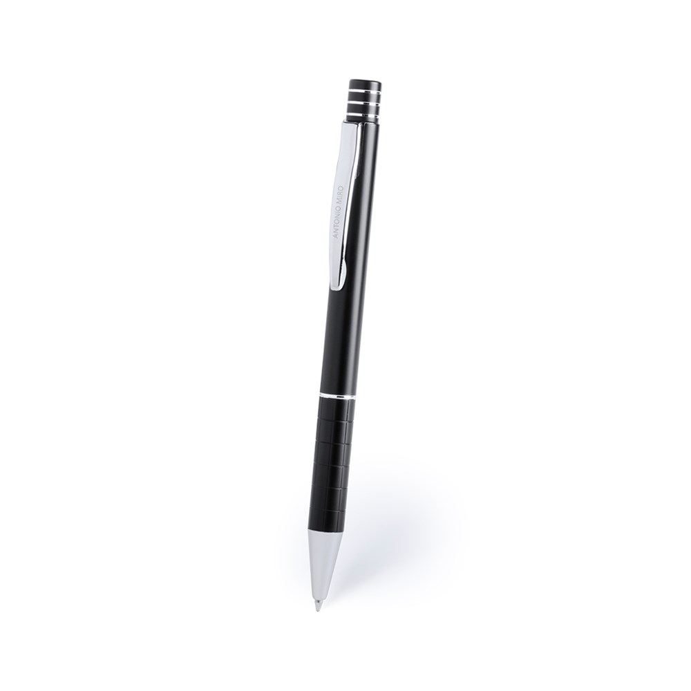 Dreh-Kugelschreiber von Antonio Miró mit elegantem Design und geschmeidigem Aluminiumgehäuse mit silbernen Kontrastdetails. Druckknopf mit Ring-Design und origineller Metallclip. Präsentiert in einem individuellen Aluminium-Case in Schwarz mit dem Markenlogo. Blaue Tinte.