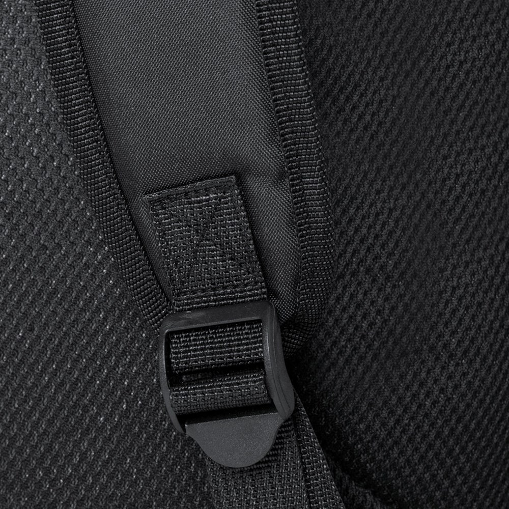 Antonio Miro Rucksack aus strapazierfähigem 300D Polyester mit schwarzer Oberfläche. Hauptfach und Außentaschen mit passendem Reißverschluss Tragegriff und Seitentaschen. Seitlich verstellbare Riemen mit Schnallenverschluss und Markenlogo am Boden. Gepolsterte Innenfächer für Laptops bis zu 17" und Tablets bis zu 10". Gepolsterter Rücken und verstellbare, gepolsterte Schultergurte mit hinterer Verstellmöglichkeit für Trolley-Stange.