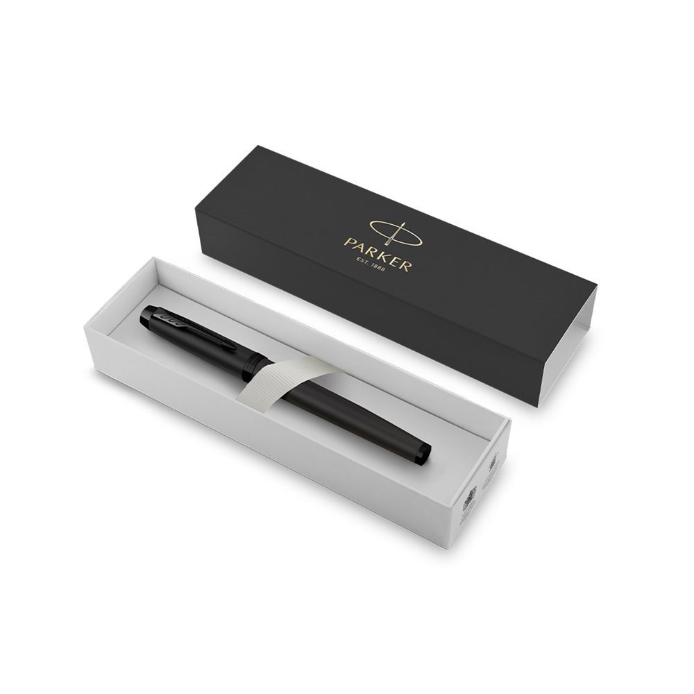 Roller Parker IM Achromatic, aus Edelstahl gefertigt mit einer matten schwarzen Lackierung und schwarzer Tinte. Mit schwarzen Akzenten und dem unverwechselbaren Clip mit der markentypischen Pfeilspitze am Kappe. Ein elegantes, raffiniertes Design mit bewährter Effizienz, ergänzt durch eine moderne Silhouette. Präsentation in einer individuellen schwarzen Box mit dem Parker-Logo. Parker IM ist die Einstiegsserie in die Parker-Welt, die in jedem Detail sorgfältig verarbeitet ist und für den täglichen intensiven Gebrauch konzipiert wurde. Mit Parker Quink-Tinte, die ein flüssiges und zuverlässiges Schreiben auf Papier ermöglicht.
