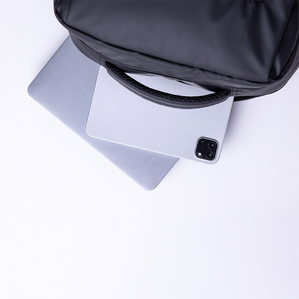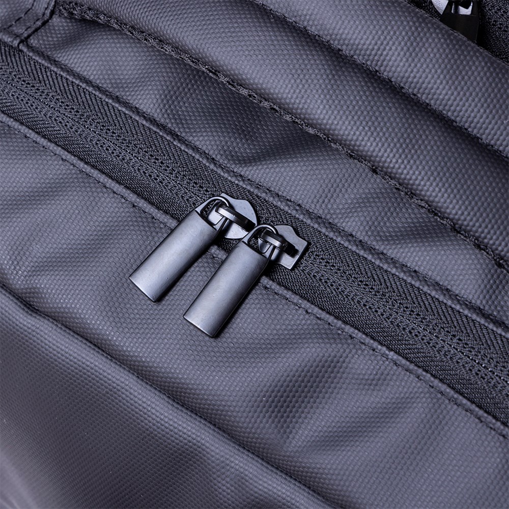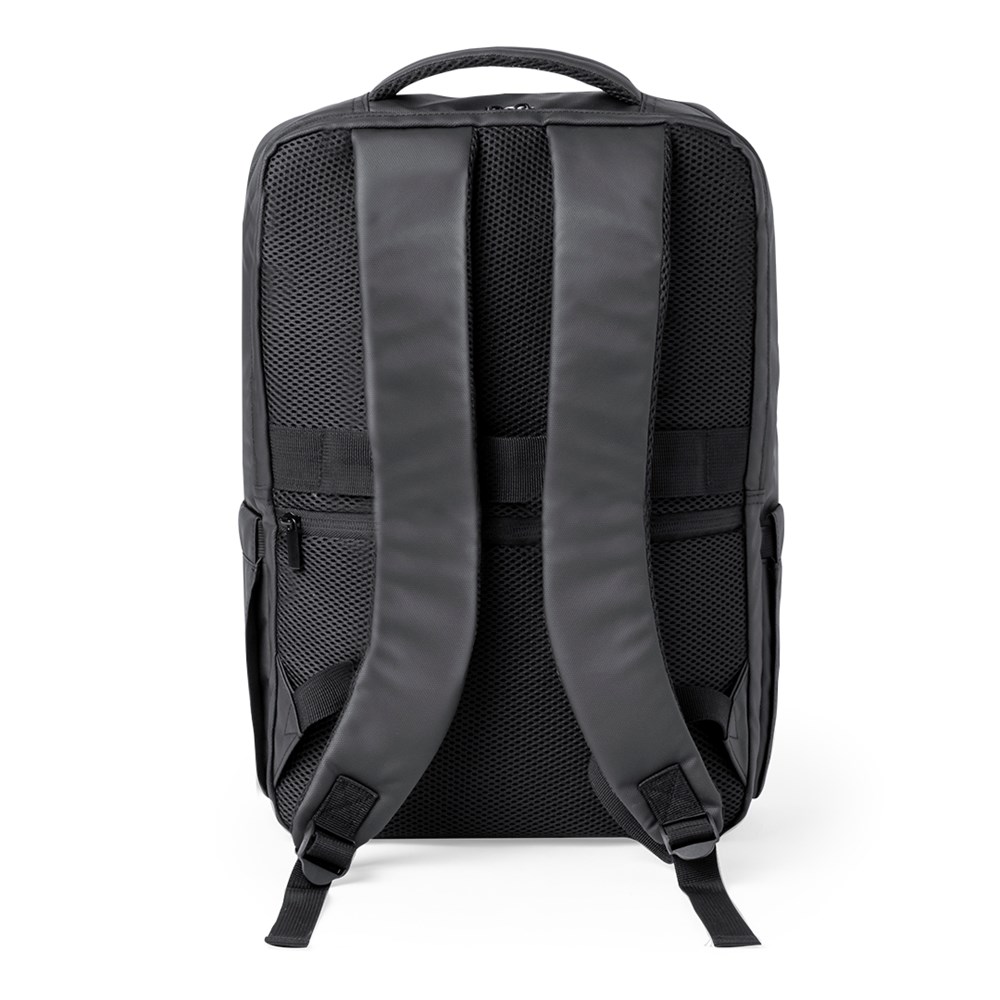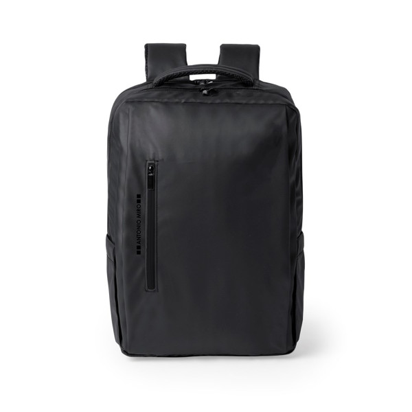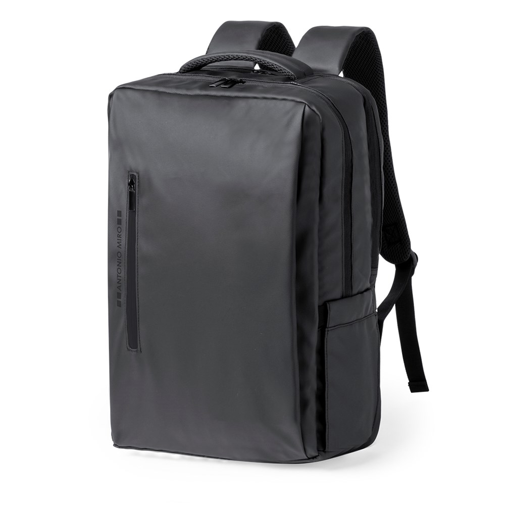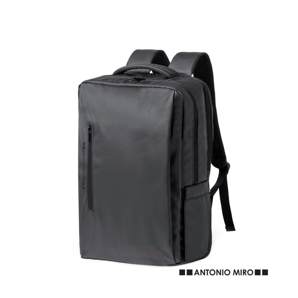 Hochwertiger Rucksack von Antonio Miró aus widerstandsfähigem Kunstleder mit schlichtem Design in Schwarz. Mit doppeltem Reißverschluss, Vordertasche und verstärktem, gepolstertem Griff. Mit ergonomischer Polsterung an Rücken und Schultergurten verfügt es über ein gepolstertes Innenfach für einen Laptop bis 15 Zoll und für Tablets bis 10 Zoll. Zusätzlich mit einer diebstahlsicheren Tasche mit Reißverschluss auf der Rückseite. Innenhüllen für Stifte und Smartphone. Mit Markenlogo auf der Vorderseite.Gepolstert.