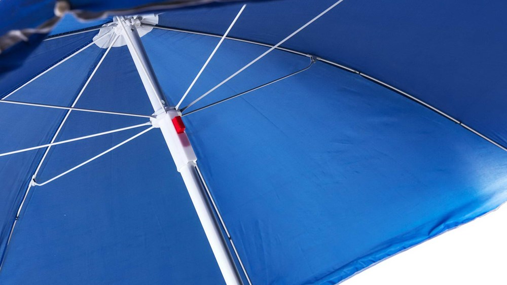 Sonnenschirm mit 8 Panelen aus robustem Nylon in verschiedenen lebendigen Farben. Mit einem Durchmesser von 150 cm, Paspelierung an den Rändern und höhenverstellbaren Metallrohren in Weiß. Präsentiert in einer PVC-Hülle mit Schultergurt.
