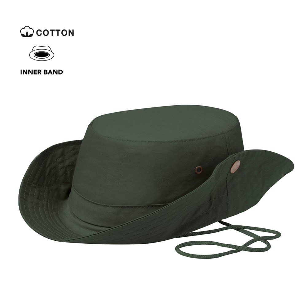 Safarihut aus 100 % Baumwolle. Angenehm zu tragen und mit seitlichen Belüftungsöffnungen, verstärkt mit Metallösen. Mit verstellbarer Krempe mit Druckknöpfen sowie farblich passendem Hutband.