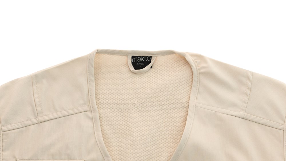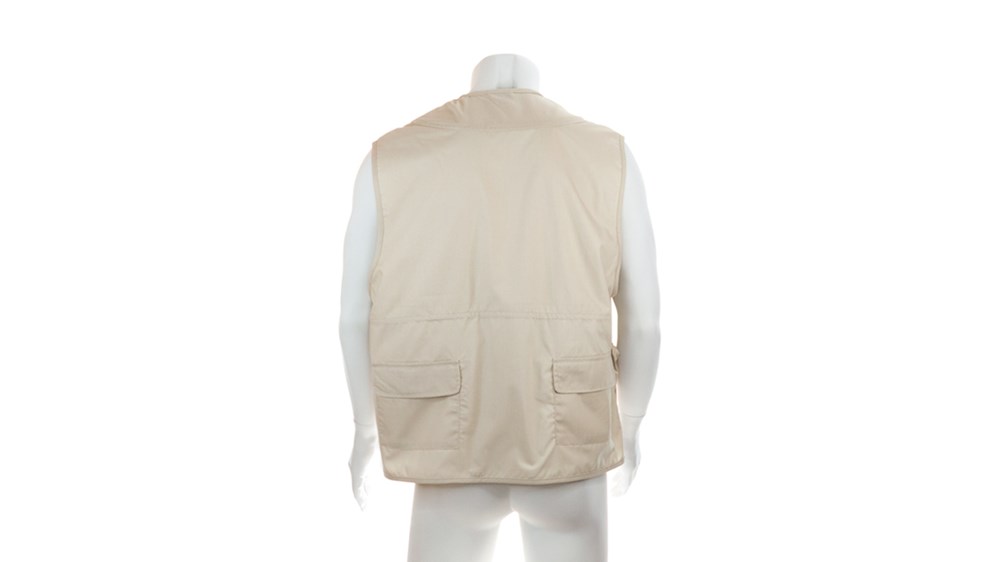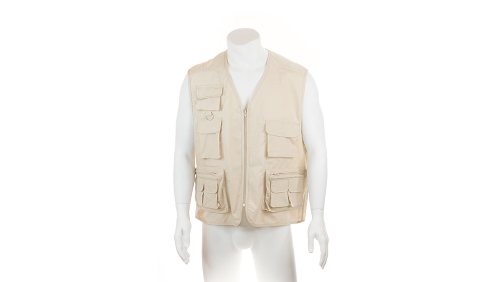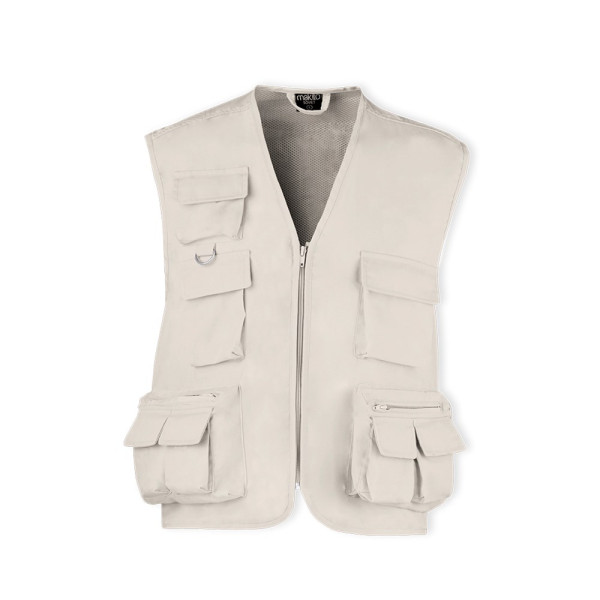 Weste aus einer resistenten Baumwoll/Polyester-Kombination in kräftigen Farben. Mit Reißverschluss, mehreren Vorder- und Seitentaschen mit großem Fassungsvermögen und Klettverschluss sowie Metallring auf der Brust. Erhältlich in den Größen L, XL und XXL.