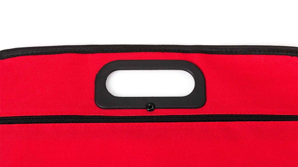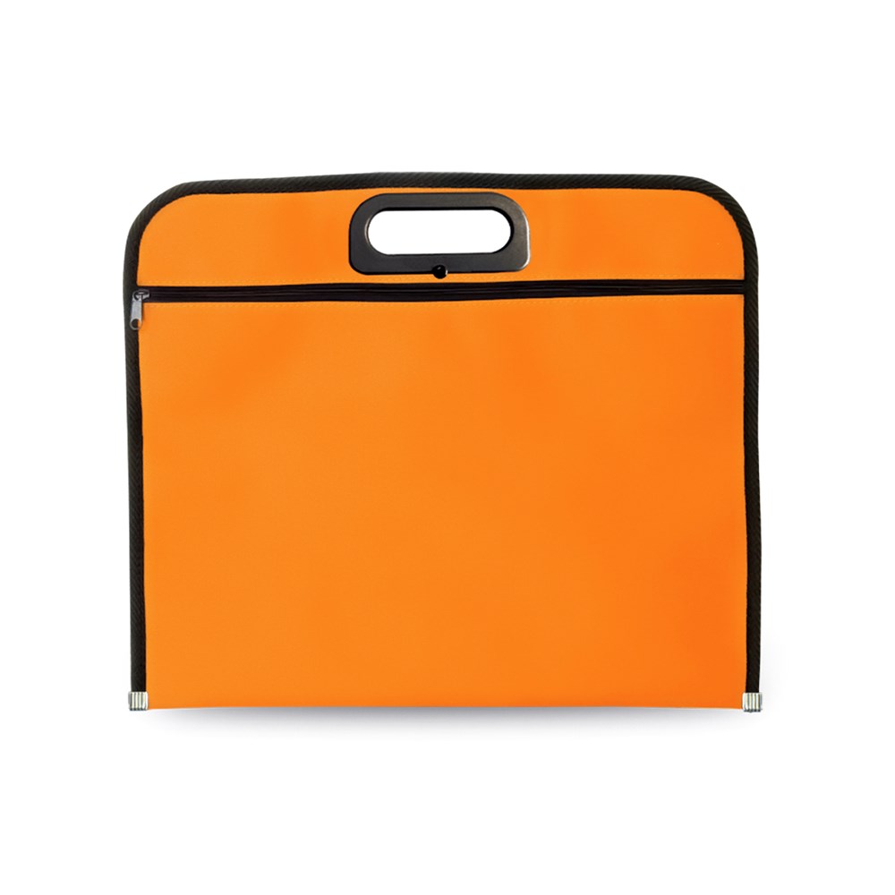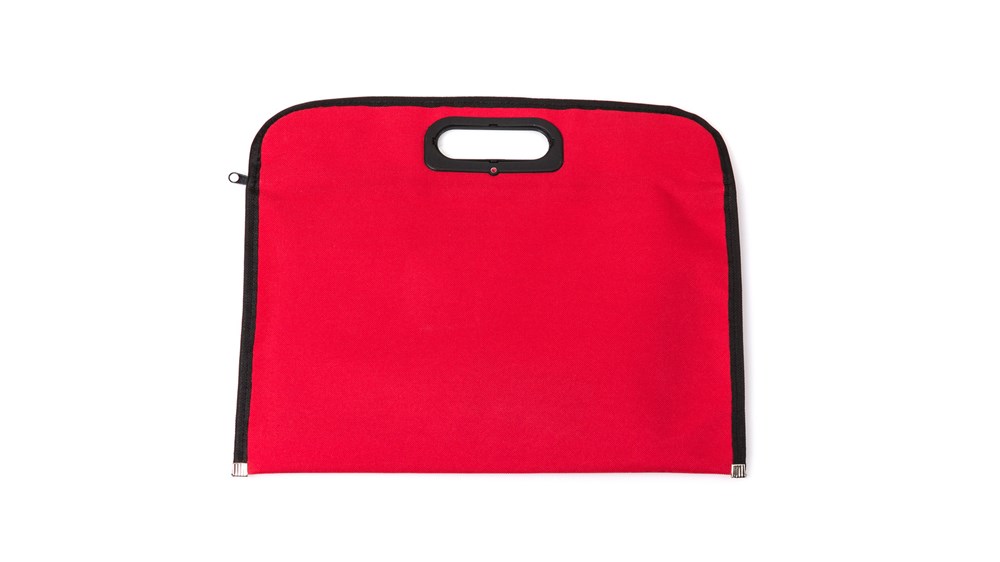 Dokumententasche mit Reißverschluss aus weichem 600D Polyester in lebendigen Farben. Tragegriffe mit originellem Design mit Stanzung, Paspel in Schwarz und Metallverstärkungen am Boden.