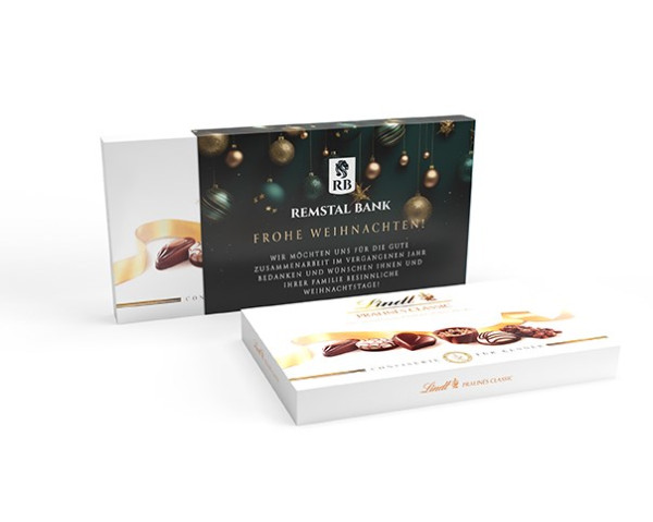 Pure Verführung mit den beliebtesten, harmonisch aufeinander abgestimmten Klassikern. Von zartschmelzenden Nuss-Nougat-Kompositionen über edle Trüffelspezialitäten bis hin zu unwiderstehlichen Marzipan-Kreationen ist für jeden Geschmack etwas dabei. Die stillvoll verpackten Pralinen werden in einem individuell veredelbaren Werbeschuber angeboten.