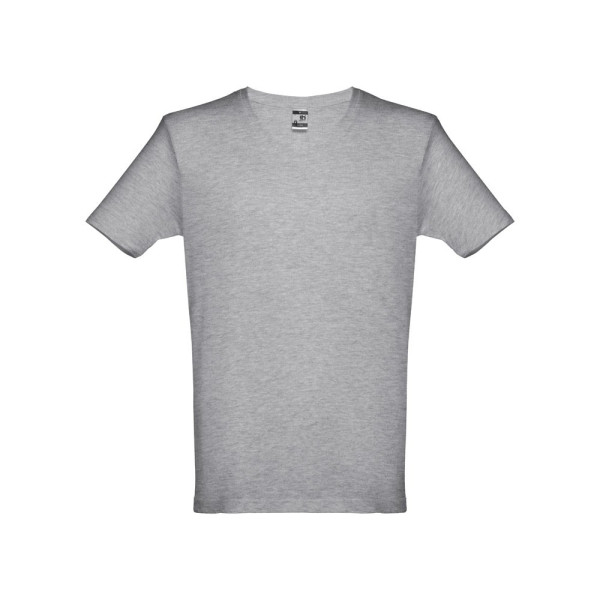 Herren T-Shirt aus 100% Strickjersey und Baumwolle (150g/m²) mit kardiertem Baumwollfaden in Tubular-Form, mit V-Ausschnitt, Verstärkungsband, Jersey-Kragen und Doppelnaht an Ärmeln und Saum. Bei den Farben 194, 195 und 199 bestehend aus 60% Baumwolle und 40% Polyester. Größen: S, M, L, XL, XXL