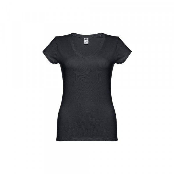 Damen T-Shirt aus 100% Strickjersey und Baumwolle (150g/m²) mit kardiertem Baumwollfaden, tailliert, überlapptem V-Ausschnitt, Verstärkungsband, Jersey-Kragen und Doppelnaht an Ärmeln und Saum. Bei den Farben 194, 195 und 199 bestehend aus 60% Baumwolle und 40% Polyester. Größen: S, M, L, XL, XXL