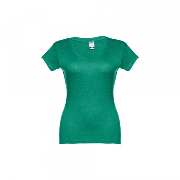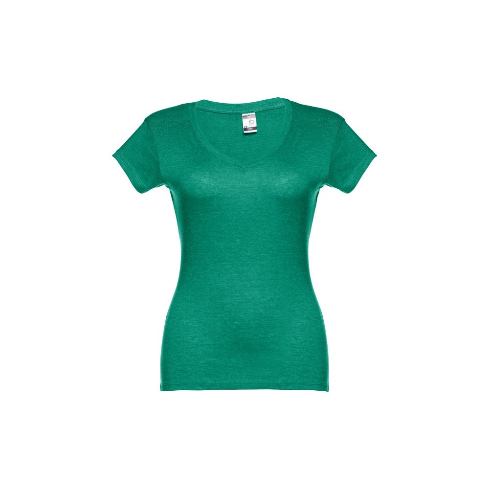 Damen T-Shirt aus 100% Strickjersey und Baumwolle (150g/m²) mit kardiertem Baumwollfaden, tailliert, überlapptem V-Ausschnitt, Verstärkungsband, Jersey-Kragen und Doppelnaht an Ärmeln und Saum. Bei den Farben 194, 195 und 199 bestehend aus 60% Baumwolle und 40% Polyester. Größen: S, M, L, XL, XXL