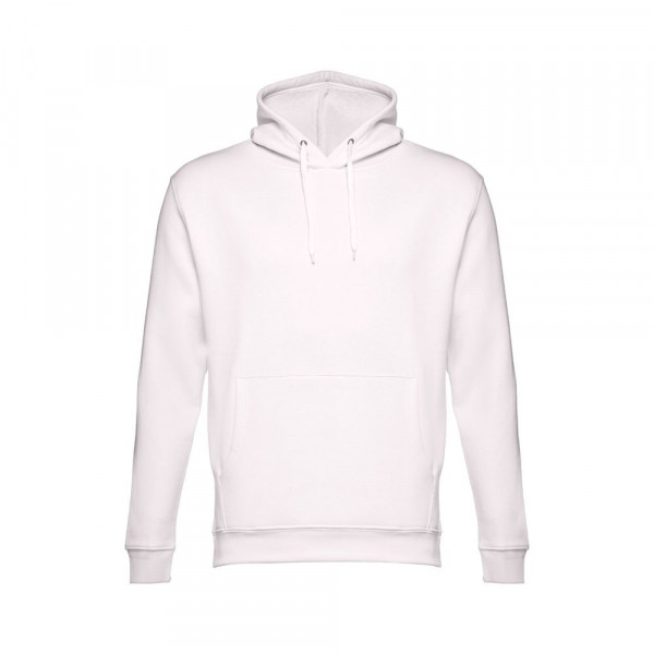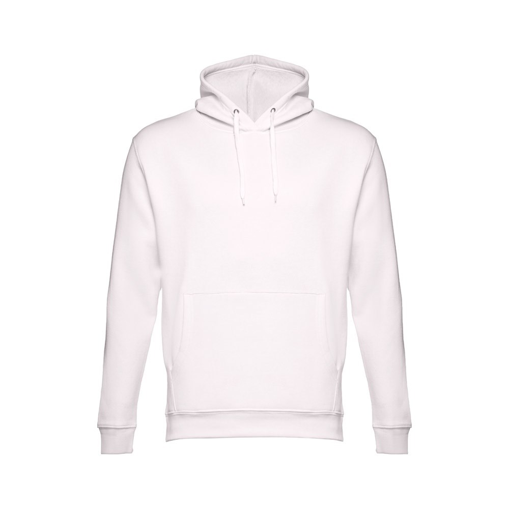Sweatshirt aus 50% Baumwolle und 50% Polyester (320g/m²), unisex mit einer Kapuze mit Kordelzug. Innen kardiert, 1x1 Ripp, Bund an Ärmel und einer Kängurutasche. Größen: XS, S, M, L, XL, XXL