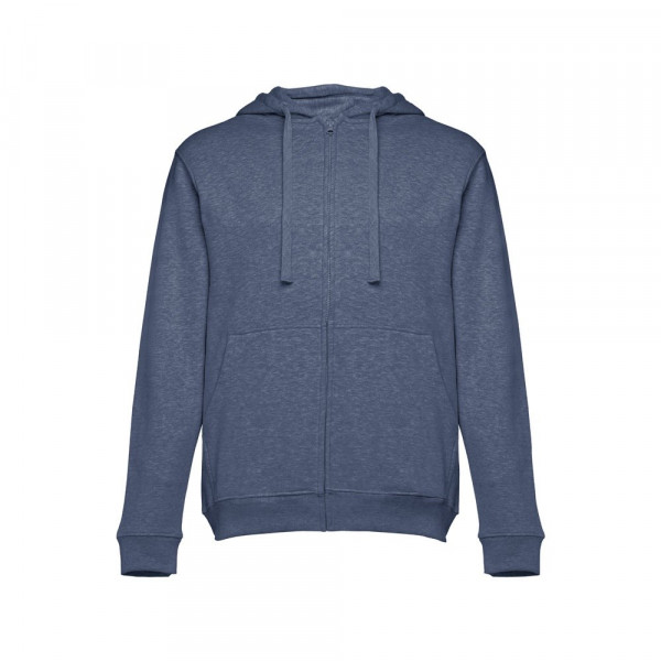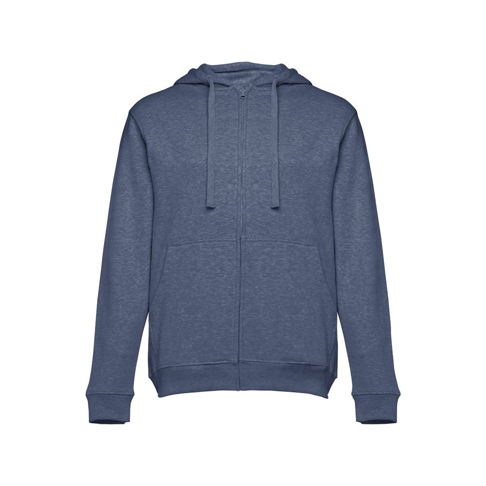 Herren Sweatjacke aus 50% Baumwolle und 50% Polyester (320g/m²) mit Reißverschluss und gefütterter Kapuze mit Kordelzug. Kardiert mit 2 Kängurutaschen, einem verdeckten Kunststoffreißverschluss und einem gerripten Bund. Größen: S, M, L, XL, XXL