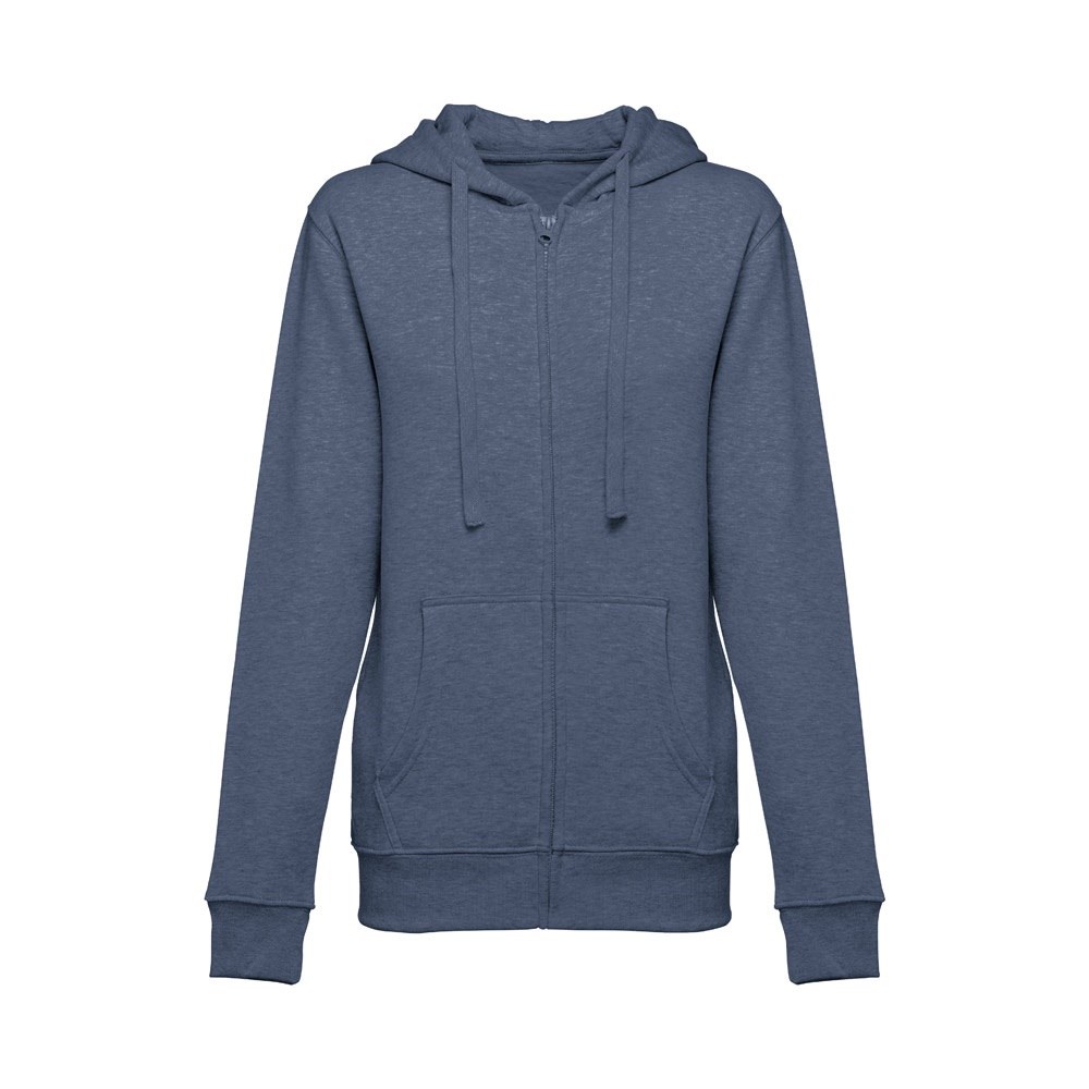 Damen Sweatjacke aus 50% Baumwolle und 50% Polyester (320g/m²) mit Reißverschluss und gefütterter Kapuze mit Kordelzug. Kardiert mit 2 Kängurutaschen, einem verdeckten Kunststoffreißverschluss und einem gerripten Bund. Größen: S, M, L, XL, XXL