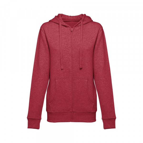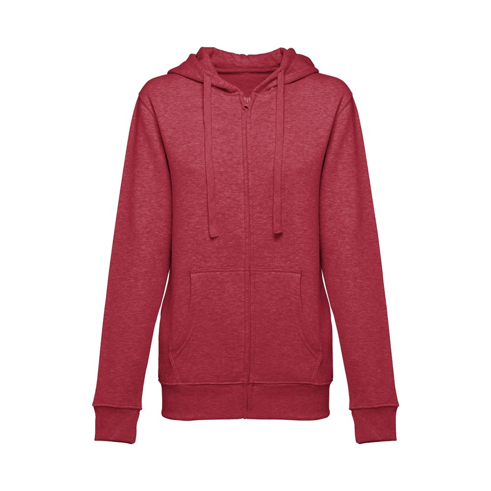 Damen Sweatjacke aus 50% Baumwolle und 50% Polyester (320g/m²) mit Reißverschluss und gefütterter Kapuze mit Kordelzug. Kardiert mit 2 Kängurutaschen, einem verdeckten Kunststoffreißverschluss und einem gerripten Bund. Größen: S, M, L, XL, XXL