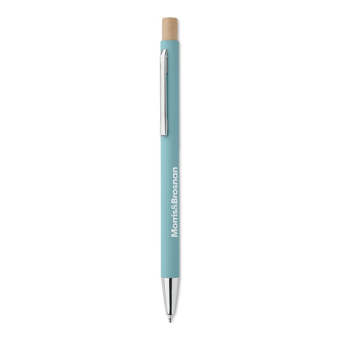 Druckkugelschreiber aus recyceltem Aluminium mit Druckknopf aus Bambus. Silberne Spitze und Clip. Blaue Tinte.