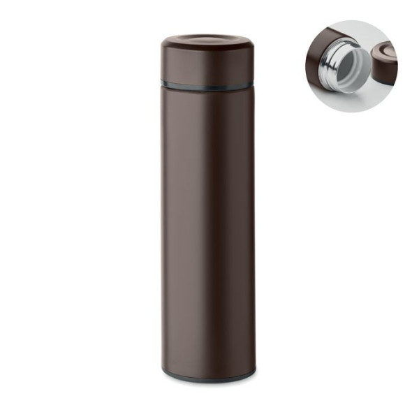 Doppelwandige Isolierflasche aus recyceltem Edelstahl (90 % recycelter Edelstahl und 10 % Edelstahl) mit keramischer Innenauskleidung. Auslaufsicher. Füllmenge: 420 ml.