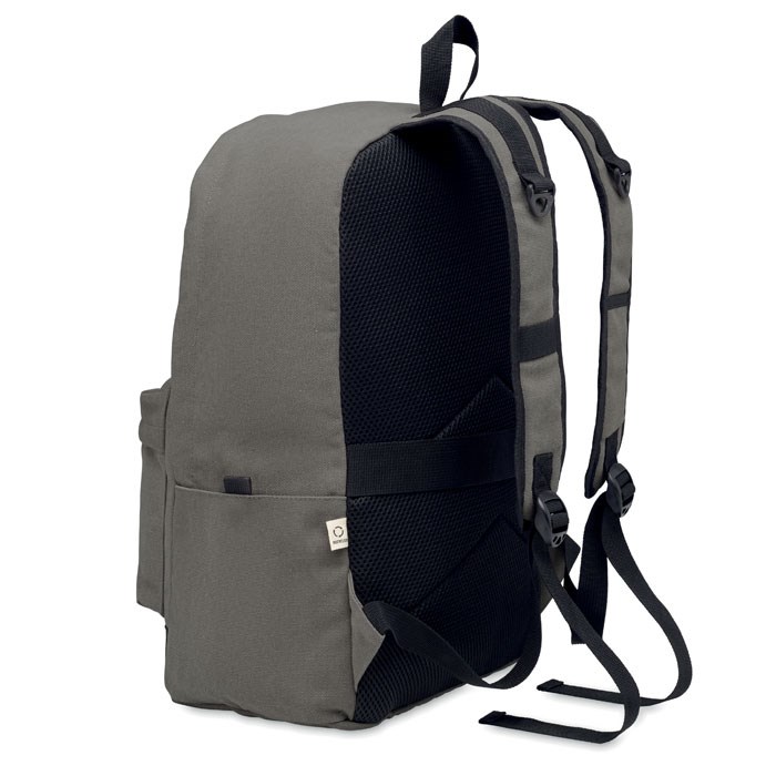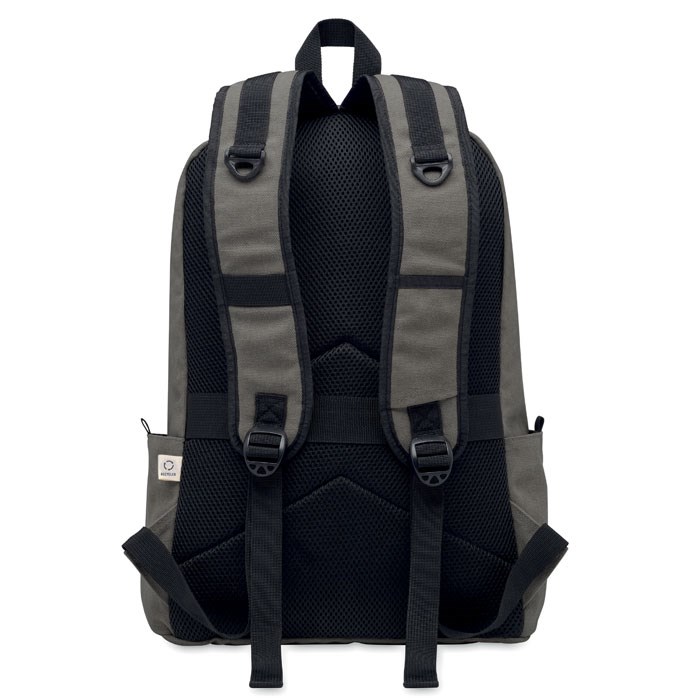 15" Laptop-Rucksack aus recycelter Pre-Consumer-Baumwolle. Große Fronttasche mit Reißverschluss und Laptop-Innenfach. Kleine Fronttasche mit Reißverschluss. Zwei seitliche Steckfächer. Rückseite, Boden und Schultergurte gepolstert. 450 g/m².