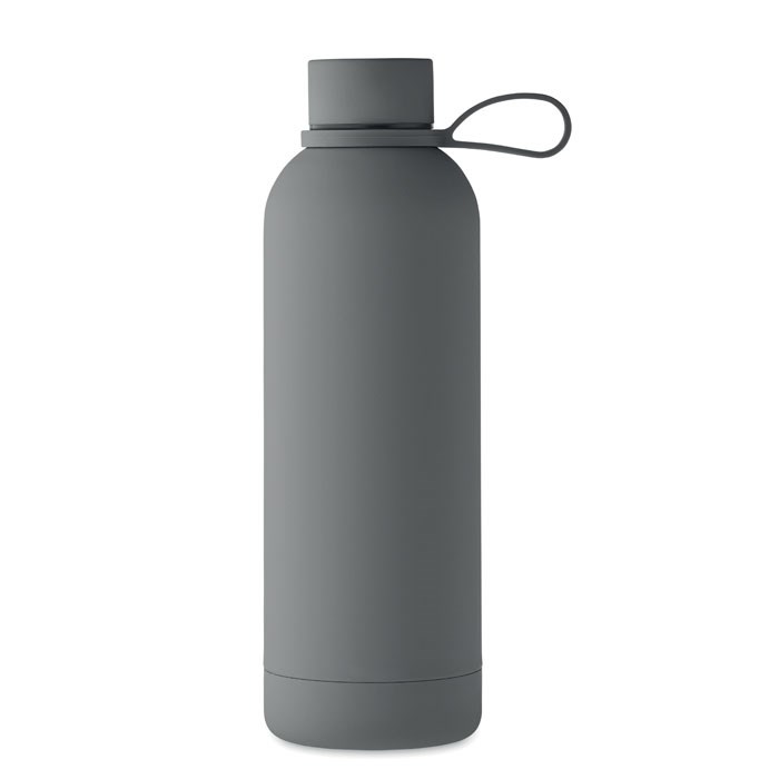 Doppelwandige Vakuum-Isolierflasche aus recyceltem Edelstahl (90% recycelter Edelstahl und 10% Edelstahl) mit gummiertem Finish und Schlaufe aus Silikon. Auslaufsicher. Füllmenge: 500 ml.