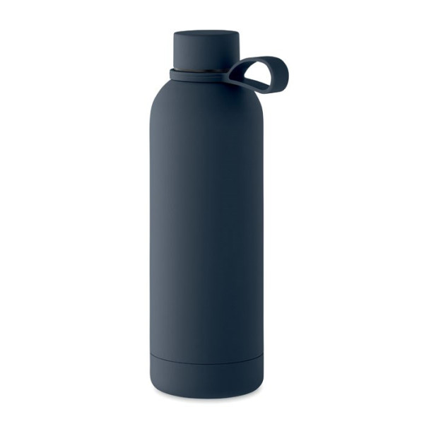 Doppelwandige Vakuum-Isolierflasche aus recyceltem Edelstahl (90% recycelter Edelstahl und 10% Edelstahl) mit gummiertem Finish und Schlaufe aus Silikon. Auslaufsicher. Füllmenge: 500 ml.