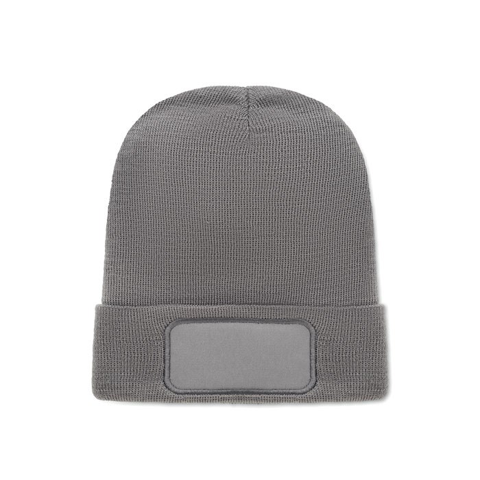Beanie aus softem, elastischem RPET-Polyester. Mit Umschlag und Aufnäher. Unisex.