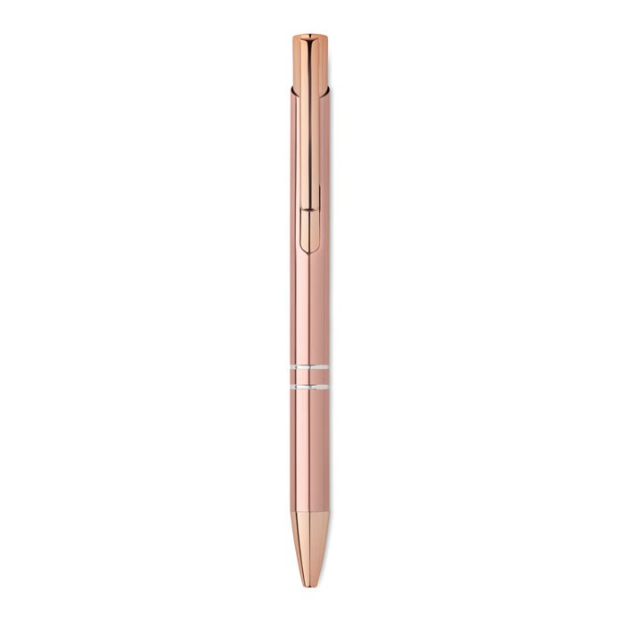 Druckkugelschreiber aus recyceltem Aluminium mit rosé goldenen Details. Blaue Tinte.