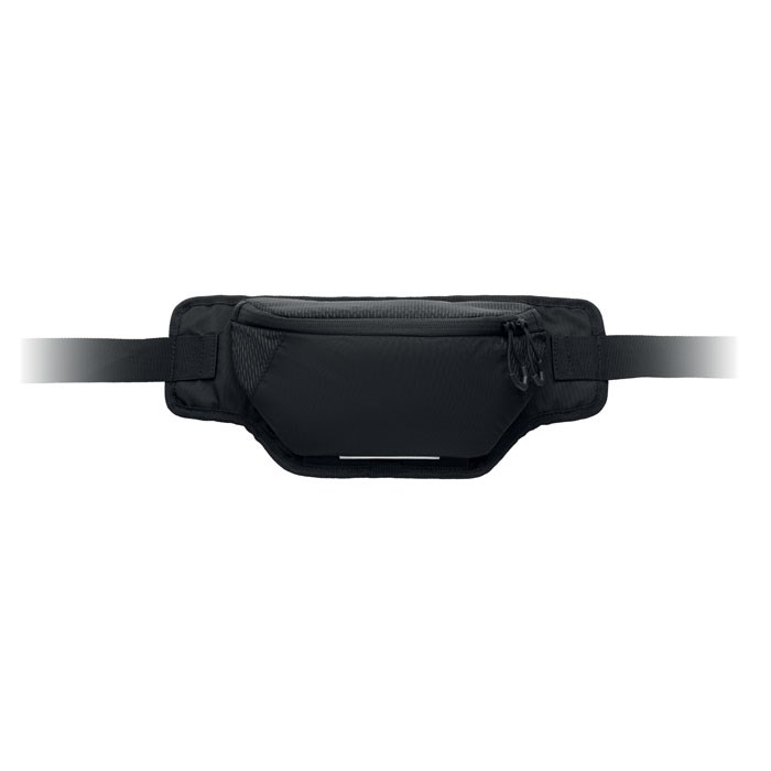 Gürteltasche aus wasserabweisendem 420D-Nylon mit 210D-Polyesterfutter. Reflektierender Streifen. Komplett gepolstertes Hauptfach. Große 2-Wege-Reißverschlussöffnung. Belüftete Rückseite.