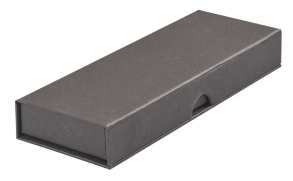 Klappetui in uni weiß, schwarz oder Carbonfaser-Look mit Magnetverschluss mit W-Einlage für ein, zwei oder drei Schreibgeräte. Kartonschuber in weiß. Auf Anfrage ist der Kartonschuber mit 4c-Gestaltung erhältlich.