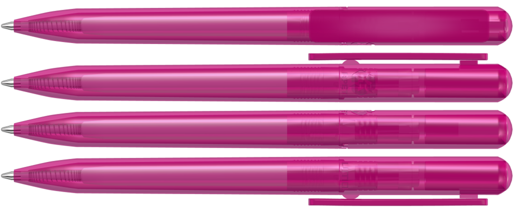 Drehkugelschreiber aus recyceltem PET-Material mit transparent glänzendem Gehäuse.