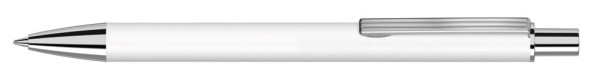 Metall-Druckkugelschreiber mit matter Oberfläche aus recyceltem Aluminium. Metallclip mit eingelassenen Rillen, Metallspitze und Drücker in silber glänzend.