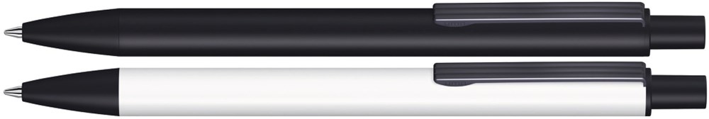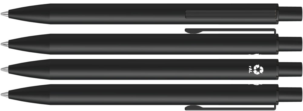 Metall-Druckkugelschreiber mit matter Oberfläche aus recyceltem Aluminium. Metallclip mit eingelassenen Rillen, Metallspitze und Drücker in schwarz matt.