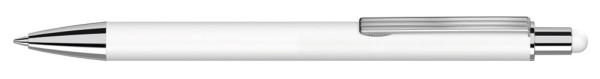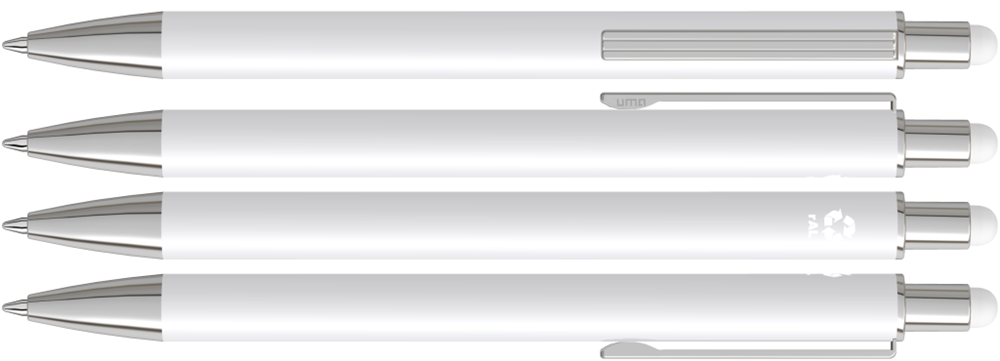 Metall-Druckkugelschreiber mit matter Oberfläche aus recyceltem Aluminium. Metallclip mit eingelassenen Rillen, Metallspitze in silber glänzend und Drücker mit integrierter Touchscreensteuerung.