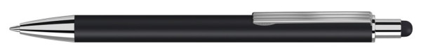 Metall-Druckkugelschreiber mit matter Oberfläche aus recyceltem Aluminium. Metallclip mit eingelassenen Rillen, Metallspitze in silber glänzend und Drücker mit integrierter Touchscreensteuerung.