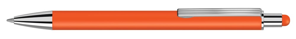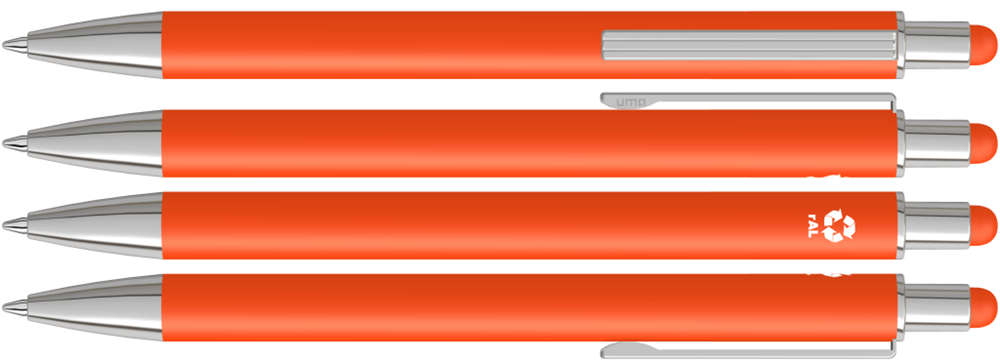 Metall-Druckkugelschreiber mit matter Oberfläche aus recyceltem Aluminium. Metallclip mit eingelassenen Rillen, Metallspitze in silber glänzend und Drücker mit integrierter Touchscreensteuerung.
