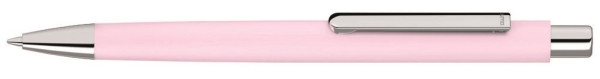 Metall-Druckkugelschreiber mit ellipsenförmigem mattem-Gehäuse. Metallclip, Metallspitze und Drücker silber glänzend.