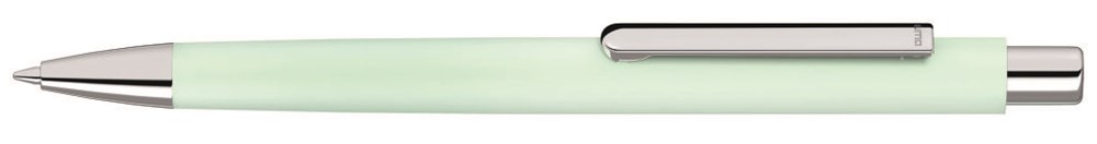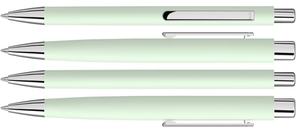 Metall-Druckkugelschreiber mit ellipsenförmigem mattem-Gehäuse. Metallclip, Metallspitze und Drücker silber glänzend.