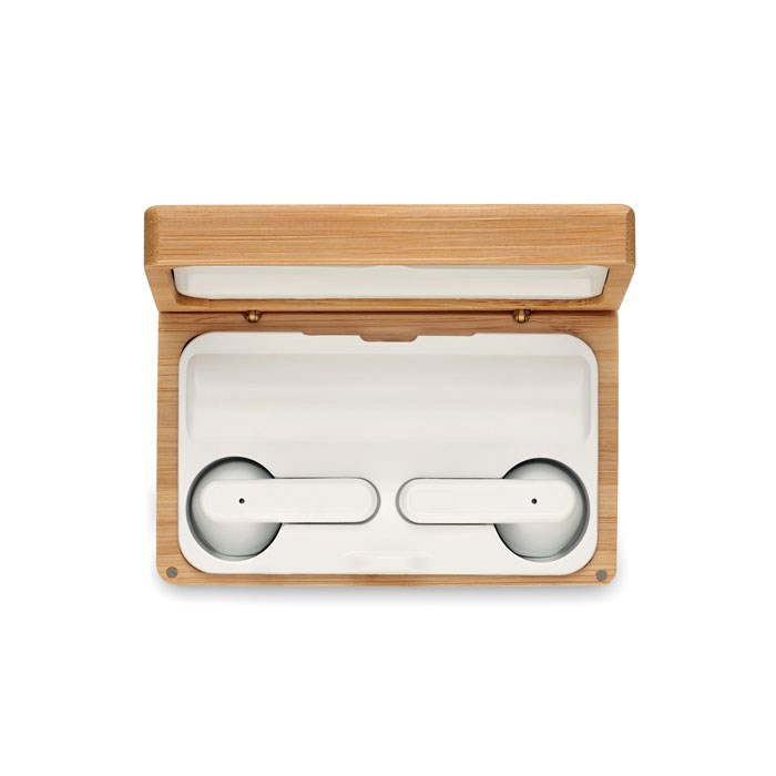 5.3 TWS True Wireless Stereo Ohrhörer-Set mit Mikrofon im Bambuscase. Inkl. 1200 mAh Powerbank... mehr