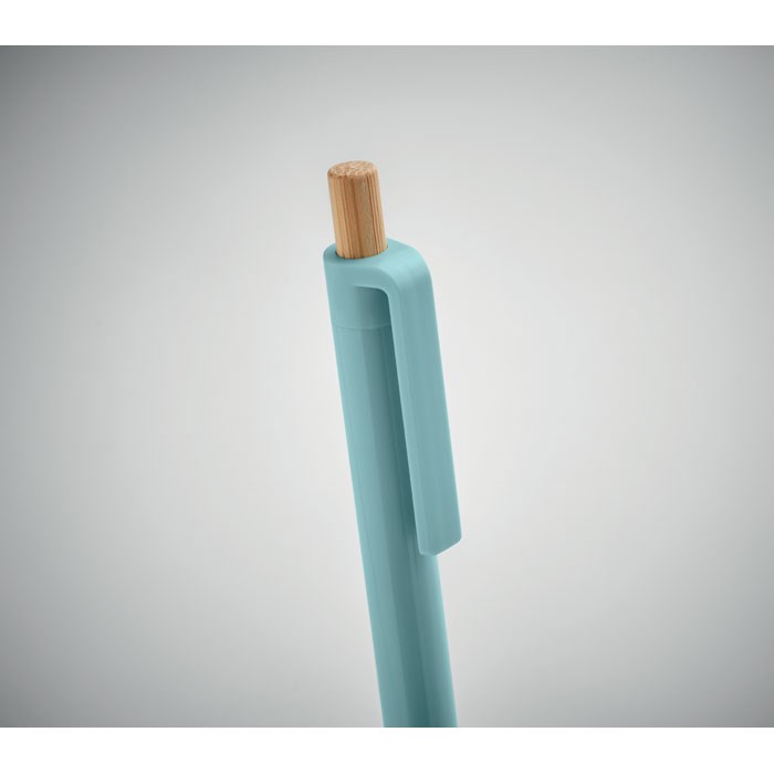 Druckkugelschreiber aus recyceltem ABS. Drücker aus Bambus. Blaue Tinte.