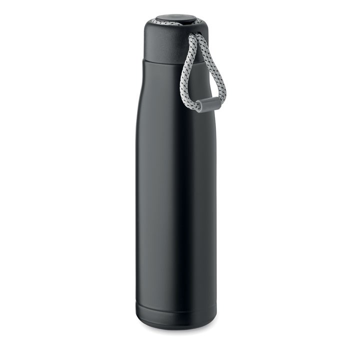 Doppelwandige Isolierflasche aus recyceltem Edelstahl (90 % recycelter Edelstahl und 10 % Edelstahl) mit integrierter Kordel im PP-Deckel. Auslaufsicher. Füllmenge: 500 ml.