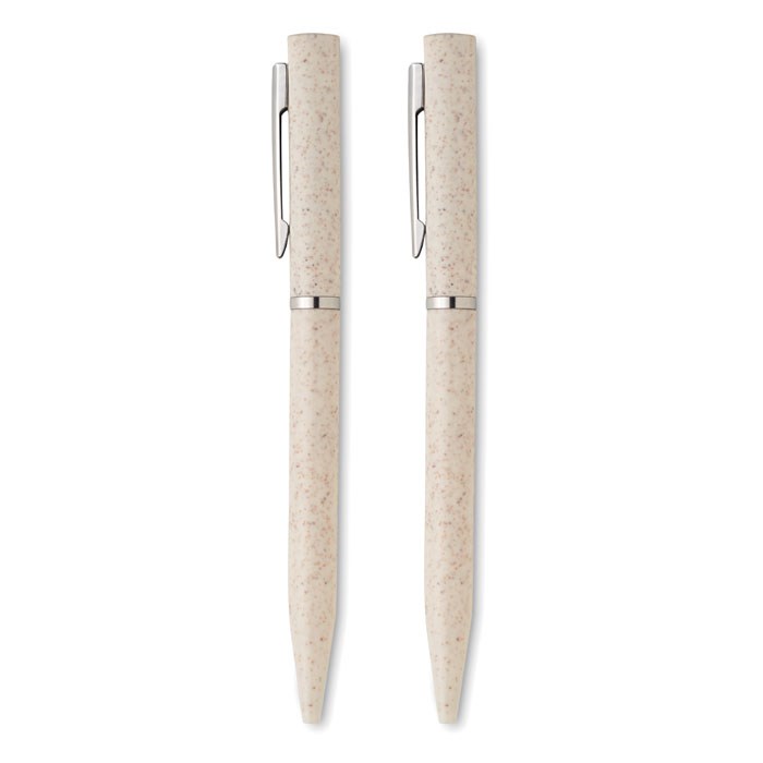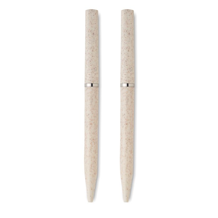 Schreibgeräte-Set mit 2 Drehkugelschreibern (1x blaue Tinte, 1x Graphitmiene). Gehäuse aus Weizenstroh/ABS. Lieferung in Schachtel aus recyceltem Papier.