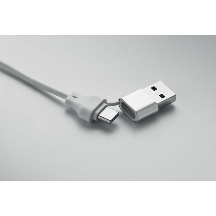 Schlüsselring mit 4in1 Datenübertragungs- und Ladekabel 60W mit Details aus Bambus. Eingang: 2in1 Typ-C <(>&<)> Typ-A. Ausgang: Smartwatch-Ladegerät (Samsung® und Apple®), Typ-C und Mikro-B (2 in 1 Pin).