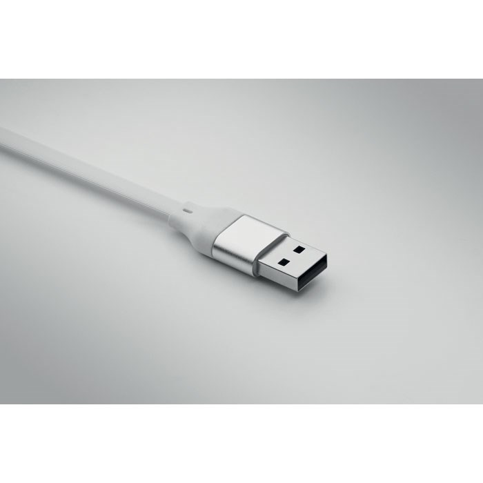 Schlüsselring mit Smartphone-Halter und 60W-Kabel. Gehäuse aus recyceltem ABS. Eingang: 2-in-1 Typ C und Typ A. Ausgang: Typ C und Mikro-B (2-in-1-Pin). Kabellänge: 26 cm.