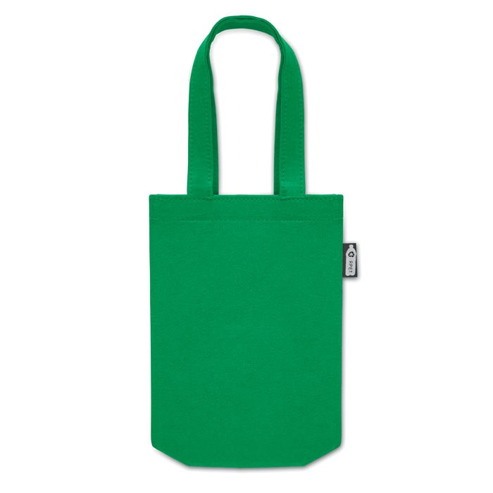 Kleine Geschenk- oder Goodie-Tasche mit kurzen Tragegriffen und Bodenfalte aus RPET-Filz. Filzstärke: 1 mm.