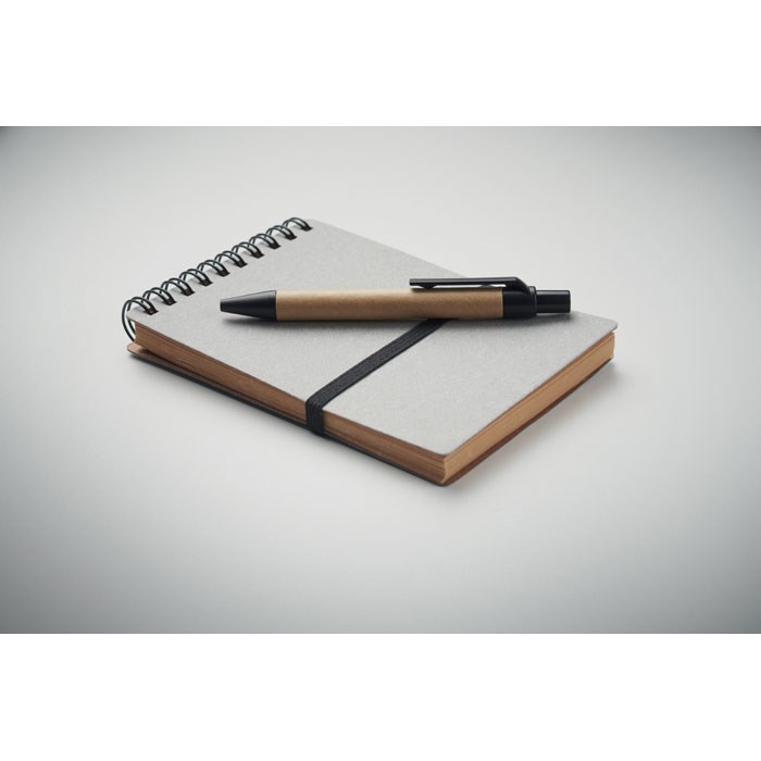 Notizbuch mit Cover aus Recyclingpapier und PU (70% Recyclingpapier, 30% PU). Spiralbindung. 70 Blatt (140 Seiten) liniertes Recyclingpapier. Elastisches Verschlussband und Stiftschlaufe. Inkl. Druckkugelschreiber aus Recyclingpapier/ABS. Blaue Tinte.